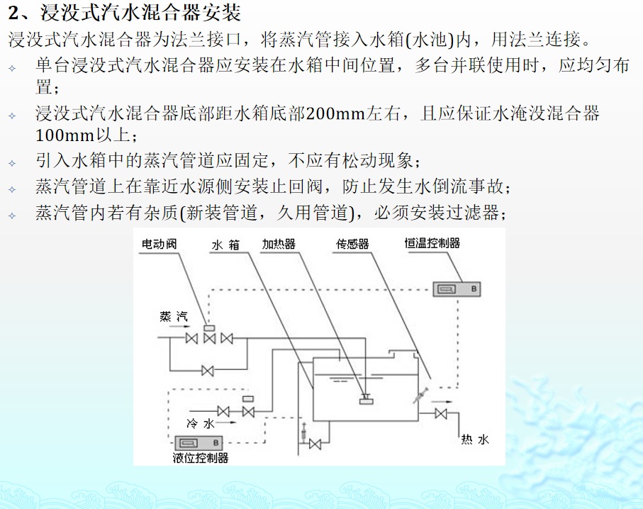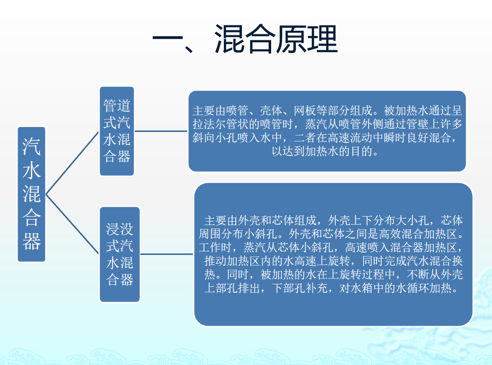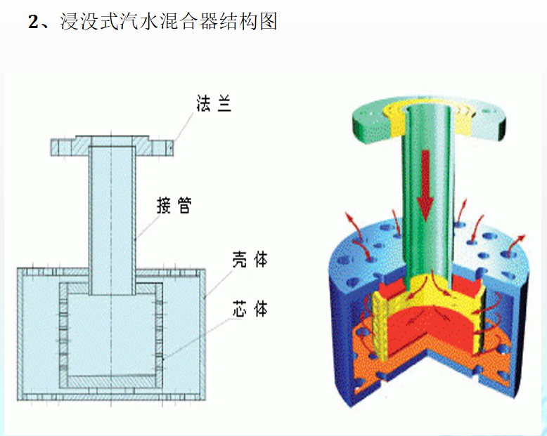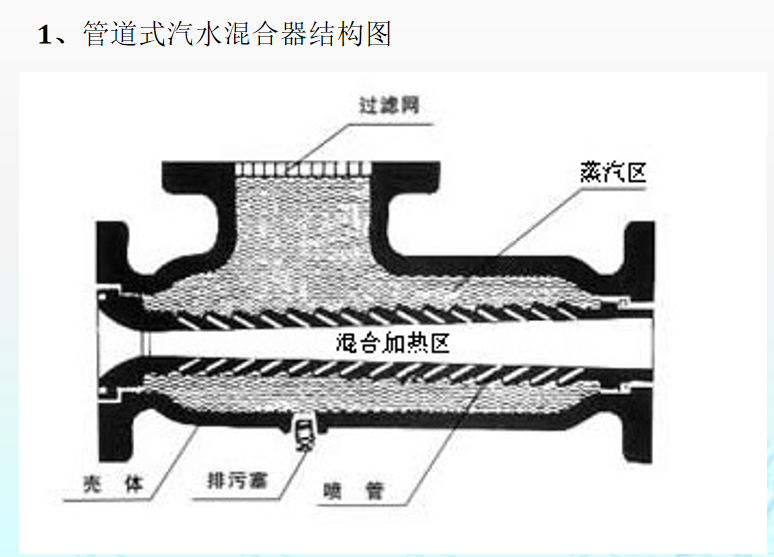 主要由噴管、殼體、網板等部分組成。被加熱水通過呈拉法爾管狀的噴管時,蒸汽從噴管外側通過管壁上許多斜向小孔噴入水中,二者在高速流動中瞬時良好混合,以達到加熱水的目的。主要由外殼和芯體組成,外殼上下分布大小孔,芯體周圍分布小斜孔。外殼和芯體之間是高效混合加熱區。工作時,蒸汽從芯體小斜孔,高速噴入混合器加熱區,推動加熱區內的水高速上旋轉,同時完成汽水混合換熱。同時,被加熱的水在上旋轉過程中,不斷從外殼上部孔排出,下部孔補充,對水箱中的水循環加熱。
