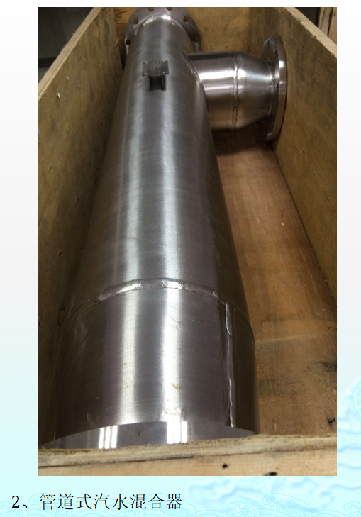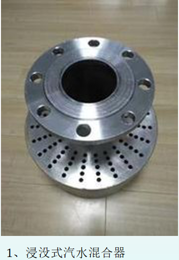 管道式汽水混合器主要由噴管、殼體、網板等部分組成。被加熱水通過呈拉法爾管狀的噴管時,蒸汽從噴管外側通過管壁上許多斜向小孔噴入水中,二者在高速流動中瞬時良好混合,以達到加熱水的目的。